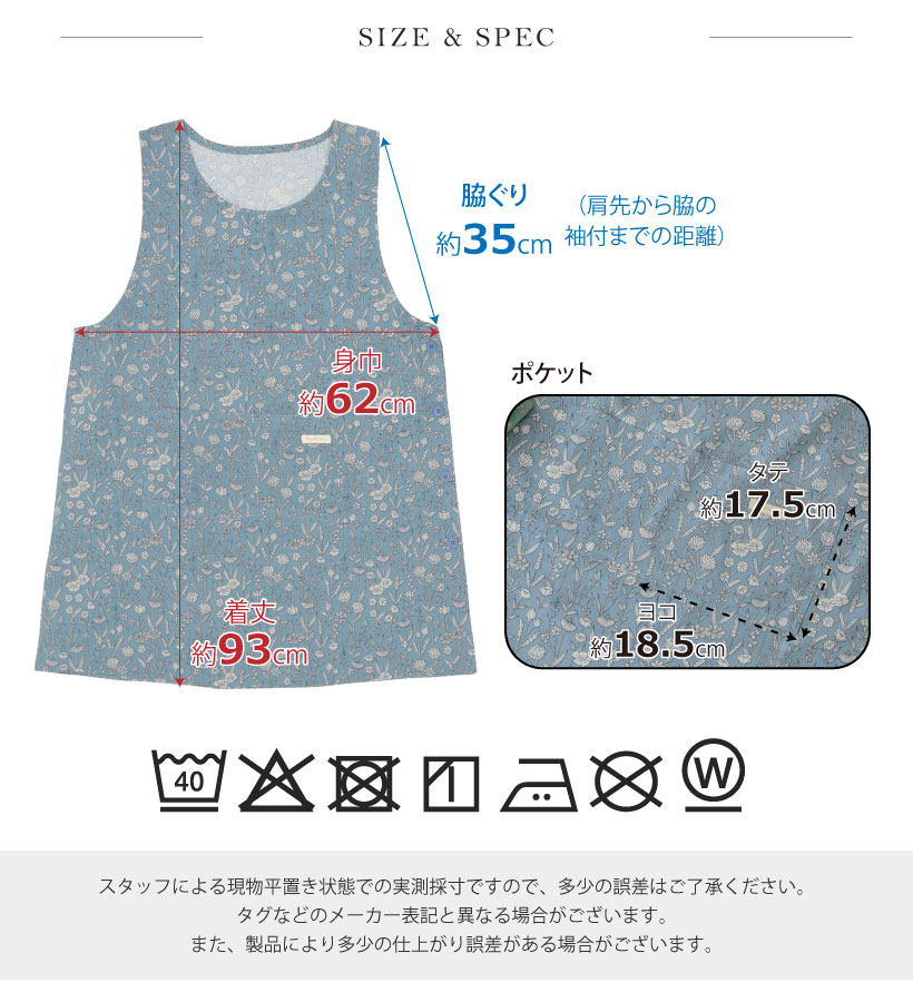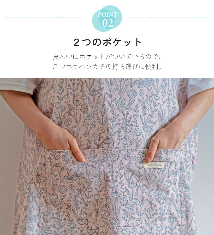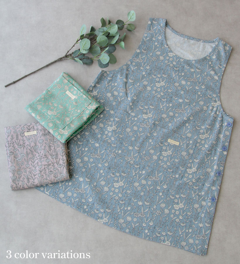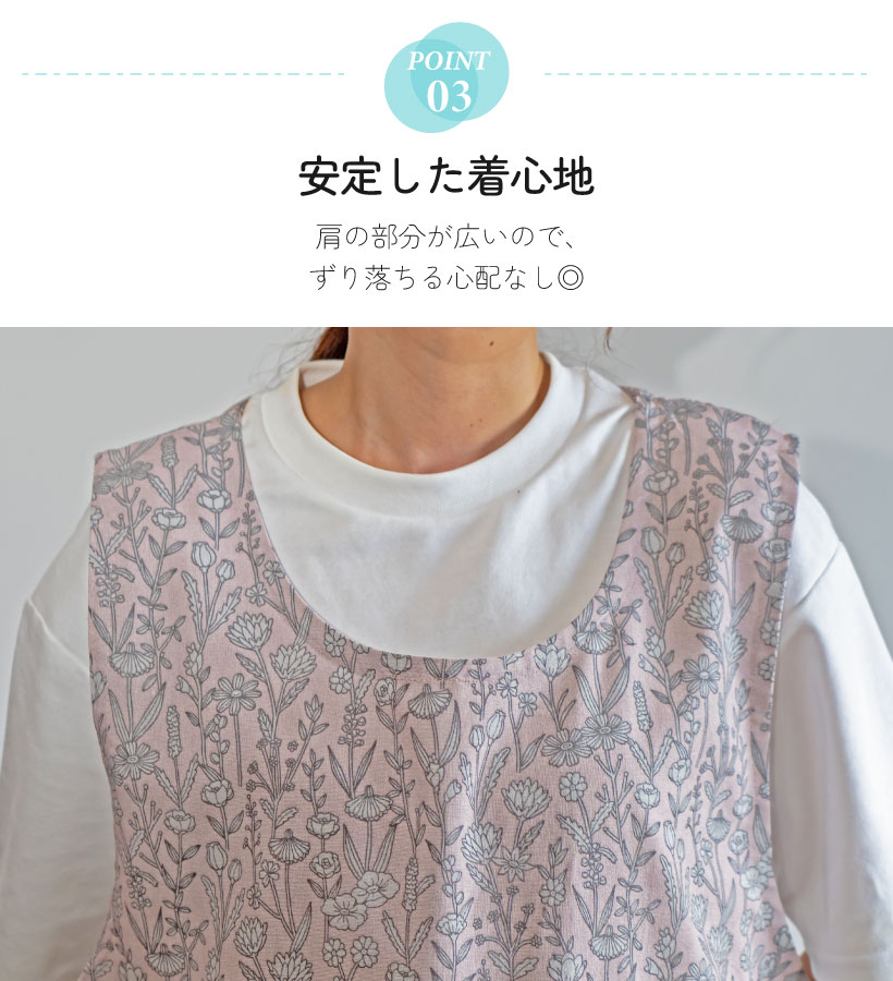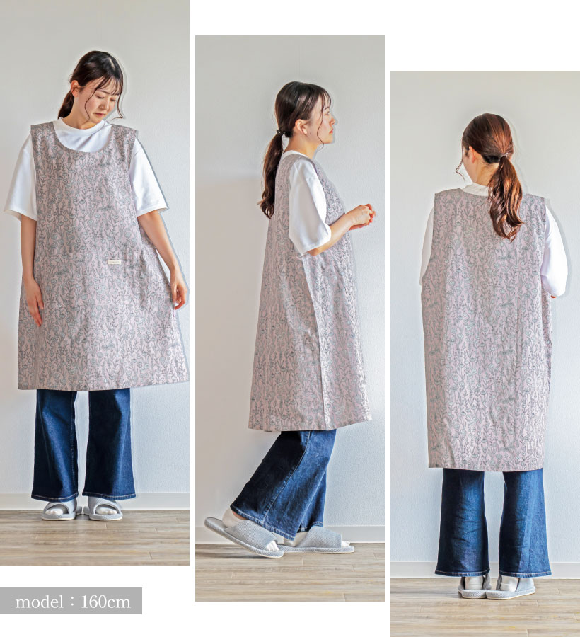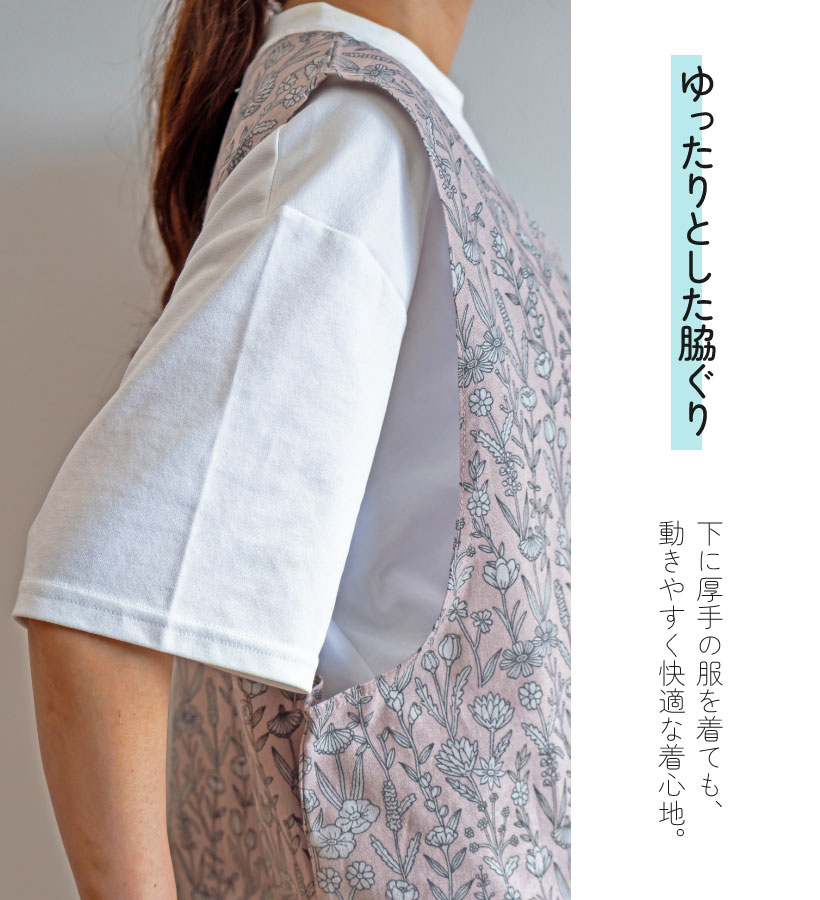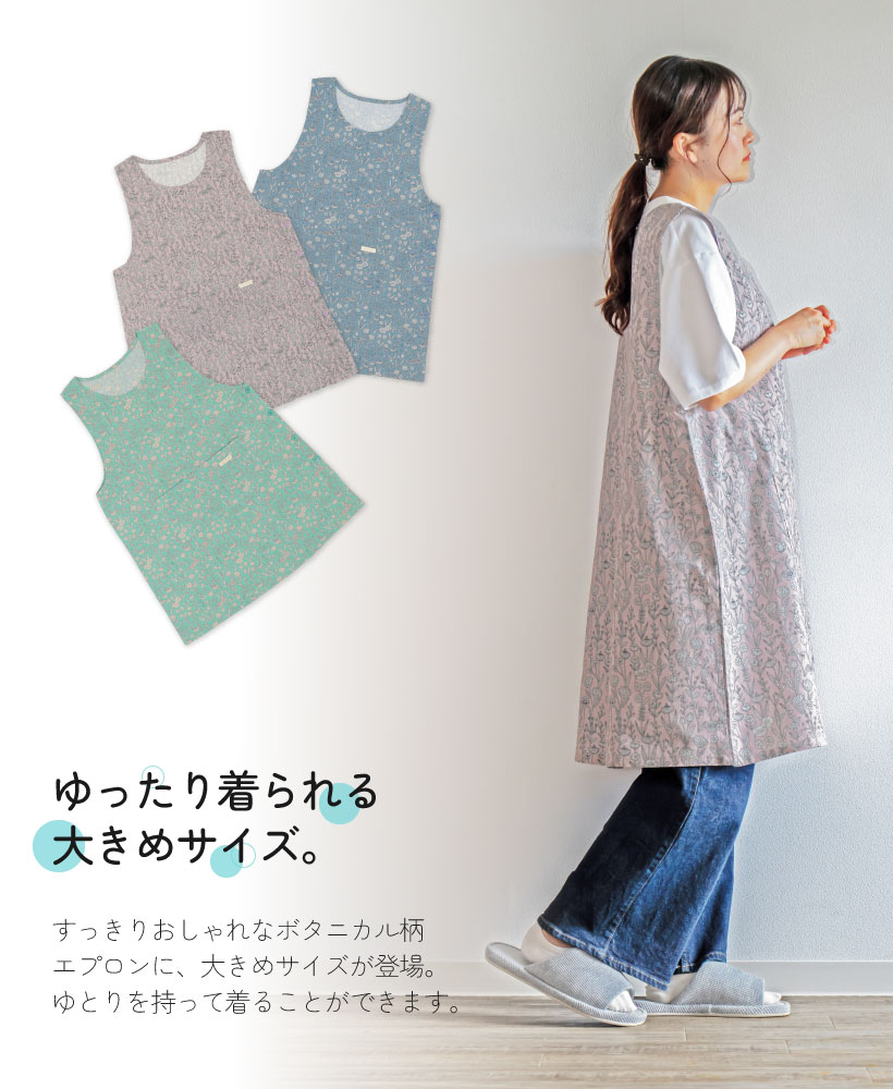 | ボタニカル柄がすっきりおしゃれなエプロンのビッグサイズ登場。ゆとりを持って着ることができます。脇ボタンで脱ぎ着するタイプのエプロンです。肩の部分が広いので安定した着心地で、ずり落ちる心配がないのもうれしいポイント◎ | |