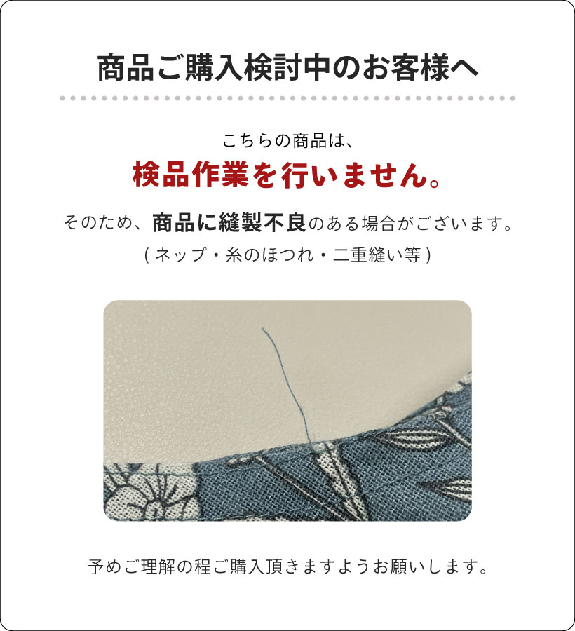 ●写真の関係で実際の商品と色合いが異なることがございます。 ●風合いを生かした素材の特性上、洗濯により9~10%縮みが生じますのでご注意下さい。水濡れや摩擦等による多少の色落ちは避けられません。濡れたまま放置しますと移染する恐れがありますのでご注意下さい。 ●二次加工(プリント)が施されているものは、プリント部分が色落ちする可能性がございます。必要以上に擦らないで下さい。 ●洗濯の際は洗濯ネットを使用して下さい。 ●洗濯の際は他のものと分けて単品でお洗い下さい。 ●アイロンをかける際は必ず当て布を使用して下さい。 ●手作りのため多少の寸法誤差はご了承下さい。 ●一度洗濯して頂いてからのご使用をお願いします。 | |
