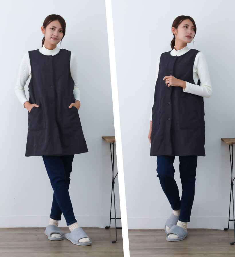 | 秋冬らしいキルティング素材を使用した暖かなエプロン。表地は撥水加工を施したキルティング素材で、水ハネや汚れをしっかりガード。裏地にはふんわりあたたかなフリース生地を使用し、寒い季節の家事や作業も快適に! | |